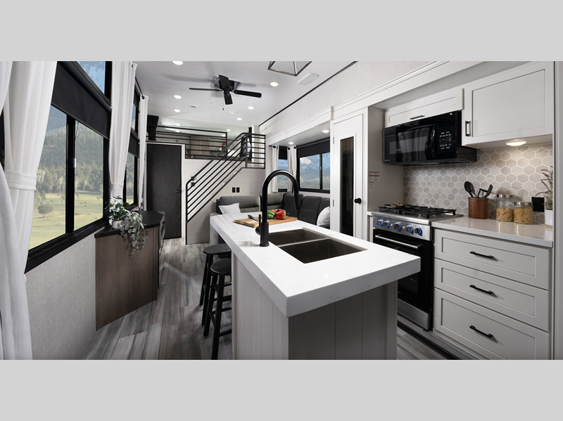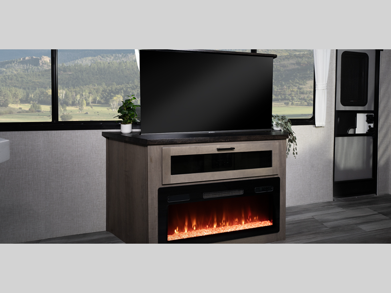 Durable construction begins with 12 inch I-Class cambered structural steel I-beams, a Magnum Truss roof system, and 5/8 inch tongue-and-groove plywood floor decking. You will appreciate the axles with electric, self-adjusting brakes and E-Z Lube hubs for smooth towing, and the insulated and enclosed underbelly within the Thermal Package will help extend your camping season. The interior will feel more like a home with hardwood look vinyl flooring, an electric fireplace, tall doorways and ceiling heights, and many more comforts.