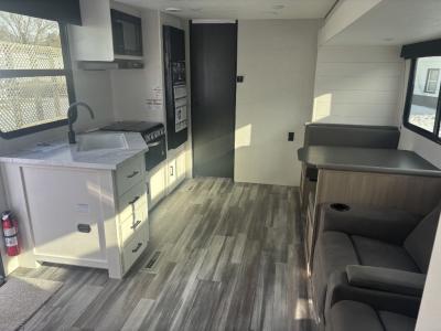 Camping trips just got a whole lot better in this spacious travel trailer for four! You'll love having a private bedroom up front with a queen bed and dual bedside wardrobes, while your guests sleep on the jack-knife sofa and booth dinette within the large slide out. There is a fully-equipped kitchen to make meals each day, plus a hidden pantry with shelves for games and a second pantry to keep snacks stocked. The full rear bath is both spacious and convenient since it's tuck away in the back. Start camping today!